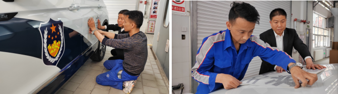 圖5為:售后漆工冶龍正在為警車貼警徽標志,他說:“警車是公務用車,每次粘警飾我都感到很神圣,干活兒特別用心細致,一定要把車身警飾做得非常好才行。警徽閃耀,守望千家萬戶。我是漆工也是工匠,必須精益求精,把活兒干漂亮,這也是汽貿漆工的臉面。每次我都把車清洗干凈,用卷尺量好間距,用記號筆畫好。在貼的過程中用刮板反復擠壓空氣,這樣才能使警徽粘得更牢固更美觀。我要把公司倡導的勞動精神、工匠精神,通過不斷地學習鍛煉,提高本領,把精湛的工匠手藝和貼心的服務傳遞給社會。